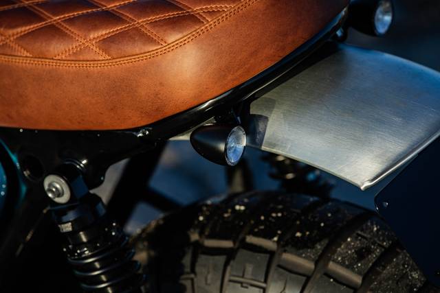 The blessing and curse of having an already classic looking motorcycle is that short of some blinkers, mirrors and a tail tidy, the cosmetics are usually taken care of for you. But this wasn't going to appease the ever ambitious Paul. The front and rear fenders were replaced with new alloy pieces. A plethora of Baak Motorcyclette parts were affixed to the chassis including leather gaiters, leather cable ties, skid plate, front indicator bracket, ignition relocation and a headlight kit with a Motogadget speedo recessed within. The stock 7/8" bars were ditched for a 1" set, the switch blocks replaced with Motonecustoms units, Purpose Built Moto scrambler mirrors and Kustom Tech brake and clutch perches finish off the simplified cockpit. Lastly Kellermann Company Bullet 1000 indicators illuminate the lefts, rights and stops.