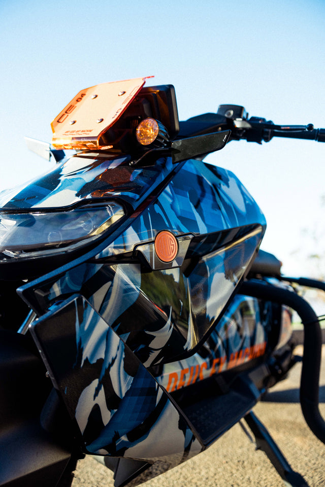 A custom gripper seat keeps you grounded even after a surf and the 3D printed rear fender designed with Vert Studio guarantees a clean ride home. Unit Garage bag holders and custom surf rack combine with the CE's underseat compartment to provide more than amp-le storage for the adventure at hand.