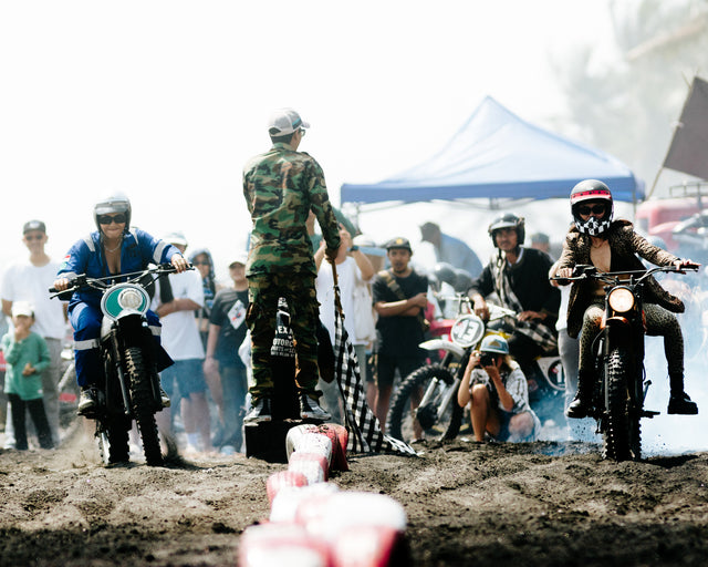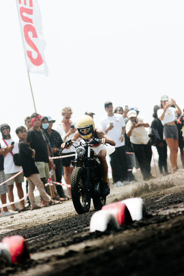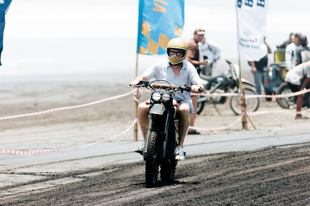 The first of the days thousand flag drops sent two riders hurtling down the sands. Whether to a win or a miss. The results to most were secondary. A chance to get in and amongst it is more important than a brief moment of glory. The unapologetic heat turned on early, hard and fast but did little or none to dampen the wave of enthusiasm that riders rode. This crazy concoction of gearheads and their getups didn’t falter to push smiles across faces all day long.