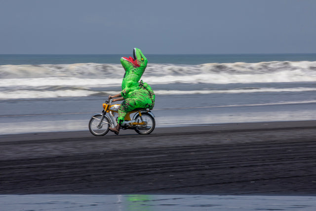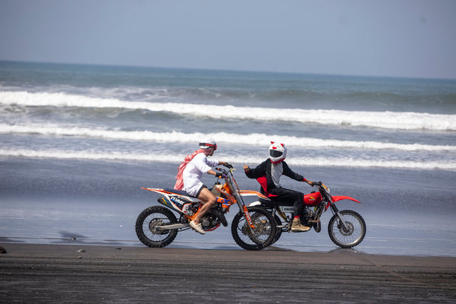 Idenya sederhana. Dua pengendara saling berhadapan. Pantai Pasir Hitam membentang sejauh 250 meter di depan mereka. Yang mengejutkan… mereka berdua mengenakan kostum. ngga mungkin salah kan ?