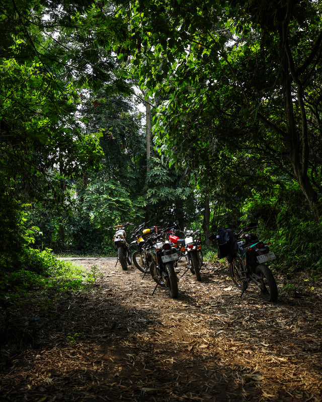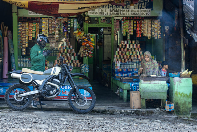 Jakarta to Bandung, a big ride to a bike show. A call went out to grab all our mates and ride. Fly along the highway until the buildings give way to trees then a twisted route from there on out. We would stick to the B-roads, shot through with potholes and punctuated by villages. We left time to veer off and run amok in the hills, eating at roadside warungs and filling up from street bottles. When the sun began to descend we’d pull over, sleep in the woods, and wake up by washing in cold streams.