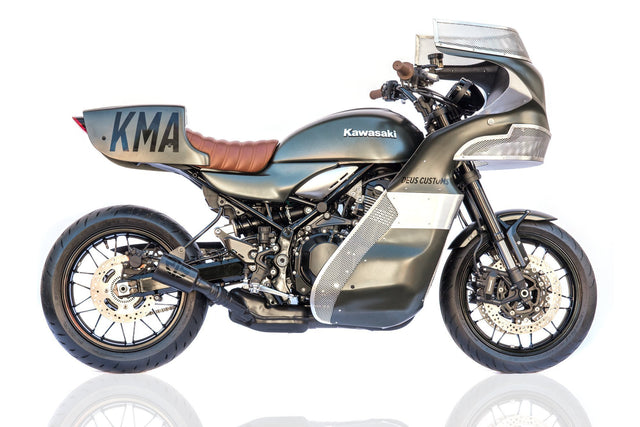 Based on the 2018 Kawasaki Z900rs We started off the main design around the full fairing from Airtech. Heavily modified and perfectly fitting the desired style we had our main piece of the puzzle. With alloy left, right and centre, the headlight was incorporated and hidden behind the perforated screen. The skirt of the fairing was also modified to fit all around the pumping in-line 4 Kawasaki engine.