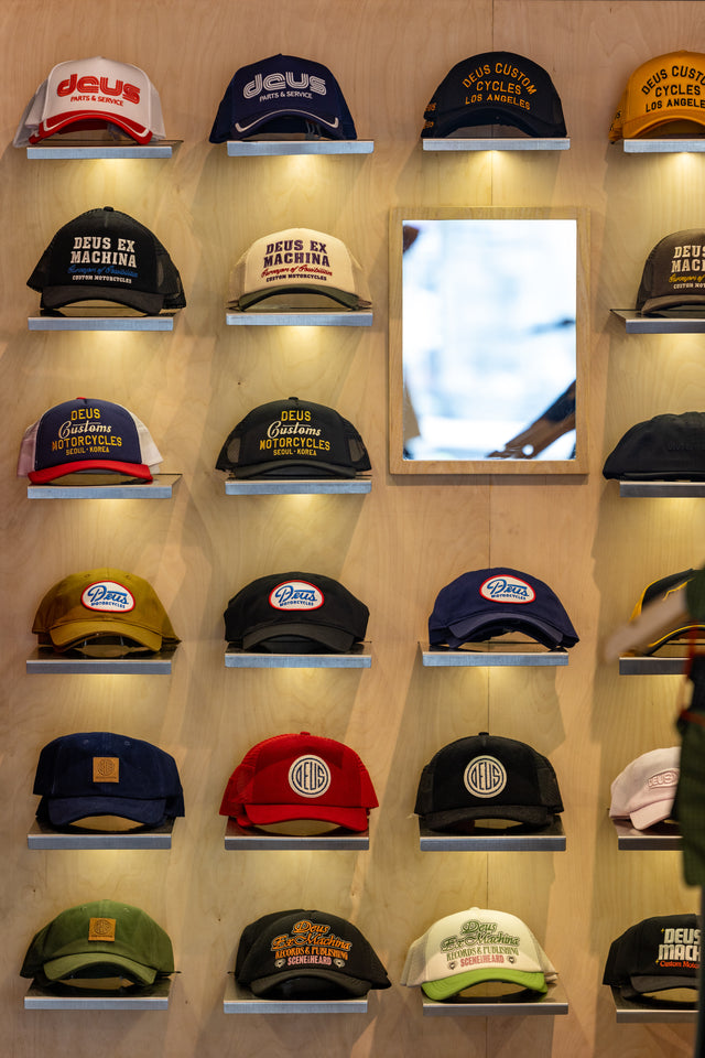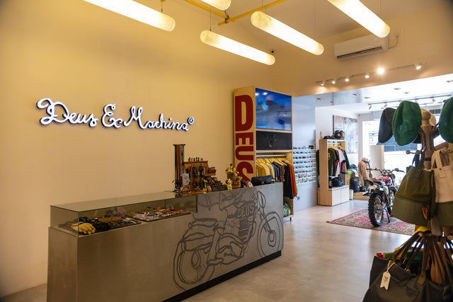 We delved into the logo archive and came up with some handmade metal Deus badges for front and sides. Turned and knurled billet aluminium foot pegs had little acid etched logos added to their ends. It’s not exactly a triple tree on these bikes but the plate that marries the risers to the forks was another inspired piece of fabrication.