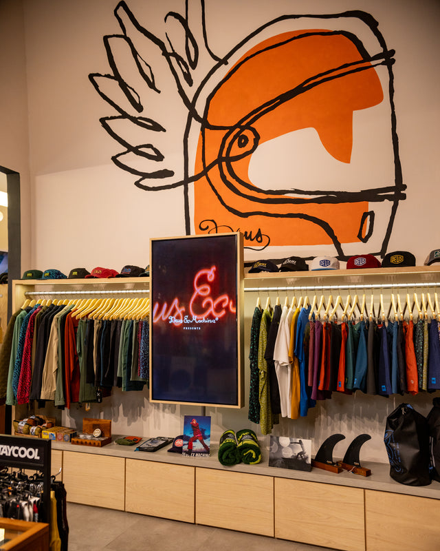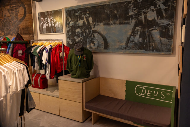 Single seater wasn’t right for a couple, but the super long original wasn’t either. A little metal rearranging and a new seat pan that we shod in a light brown suede was produced. Cherry on top, a back facing stitched Deus logo.