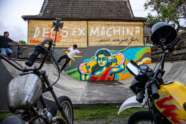 Semua hal baik pasti ada akhirnya, dan akhirnya kami kembali ke Deus Temple. Para rider memarkir motor mereka dan langsung disambut oleh tim seniman graffiti yang sedang mengerjakan mural di dinding samping depan kami sepanjang lima belas meter Tak hanya itu, ada juga sekelompok pesepeda single-speed, komunitas lain yang sama antusiasnya yang datang beriringan dengan sepeda mereka sendiri.