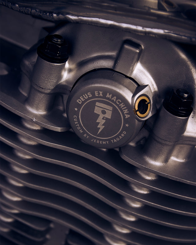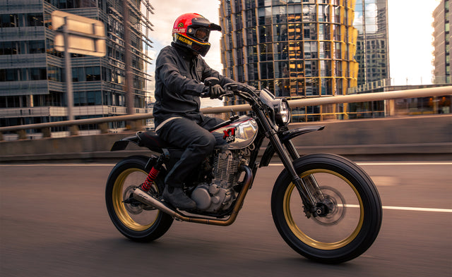 With reliable performance being front of mind, Jeremy set to work building a bulletproof engine package following a tried and tested recipe from thumper guru Carl Batey of Cafe Racer - keep up if you can! High compression piston mated to a balanced crank. Oversized valves with heavy duty valve springs and retainers, ported and flowed head, custom ground camshaft, high flow oil pump and oil cooler. The airbox was retained but breathes easier through a K&N filter and slotted airbox cover. A Keihin FCR 39 carb makes use of the extra air and a custom header pipe mated to an SC project silencer allows it to escape again. Rex's Speed Shop supplied a rewound SR500 stator, flywheel, digital ignition and 12V conversion, which is what allows us to run the Xstart electric start kit on this bike.