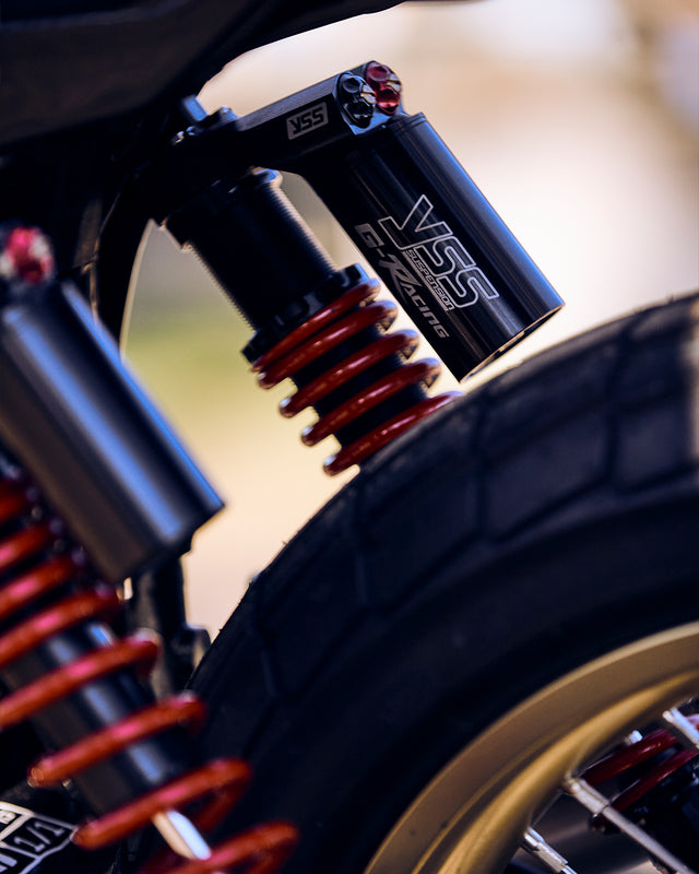 and valved by shock treatment then grafted to the frame with a set of custom CNC clamps machined with the same offset as stock. Tracker fatbars were mated to the clamps with Rizoma clamps. The swingarm was machined and spaced to accept the XT’s new custom YSS hi/lo piggyback shocks and chain alignment.