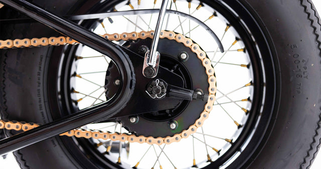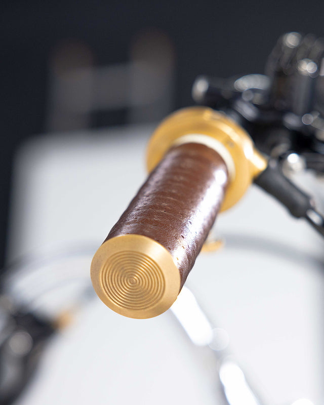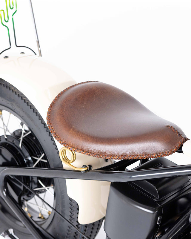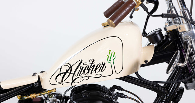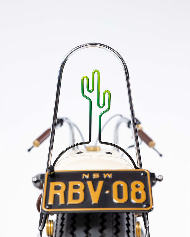 The final ten percent of the bike is where the Nut Kwaka really came into its own. The paint, courtesy of Juds Custom Paint, was finished in a cream with black and green gradient. The wheel nipples, seat springs, throttle housing, ignition switch, fuel tap (you get the point) were all finished in brushed brass and pop off the powder coated frame wheels.