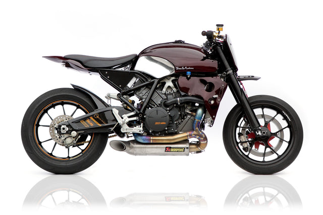 From super bike to super moto, 'The Scrappier' has held on to its super aspirations and gone off the rails and left normal conventions in the scrap bin. Starting as a full fairing‚ KTM RC8 with a 1150cc V-twin packing 151hp, it has turned into a scrappy delinquent who shows up to bare-knuckle fights in a gentleman's tuxedo. The poison apple paint is a masterful work starting with a white pearl base coat and adding a layer of bright candy red, and finally a black candy top coat.