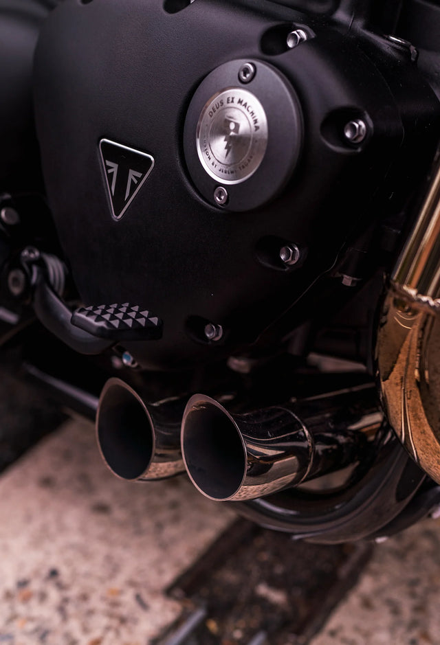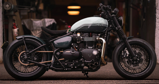 This custom bobber- the most recent creation from monsieur Tagand, arrived at the Deus Workshop almost directly from the showroom floor at triumph- with hints of new bike smell still detectable on it, Jeremy set to work stripping down the Brit. Wheels, Gone. Fenders, Gone. Exhaust, brakes, mirrors, indicators? You guessed it, GONE.