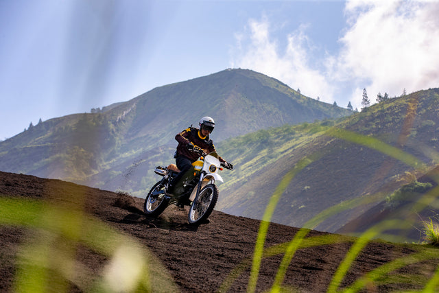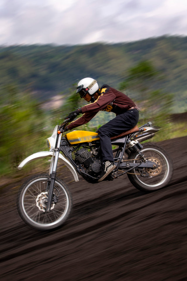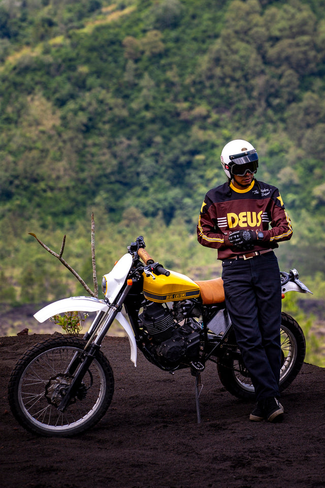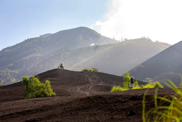 Before daylight, we headed out of the Deus compound in Canggu taking full advantage of the empty streets to throttle our way to the North. We stopped to stretch our legs, drink coffee and chat before saddling back up and hightailing it through. A big push against the traffic as the island came awake. We hit the rim at Kintamani and circulated around to the road that slopes off and down to the left, and drops down inside, it was then we saw across to the jet-black lava fields, but this time, they were all smothered in green.
