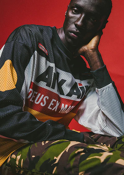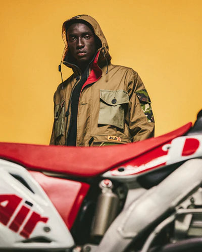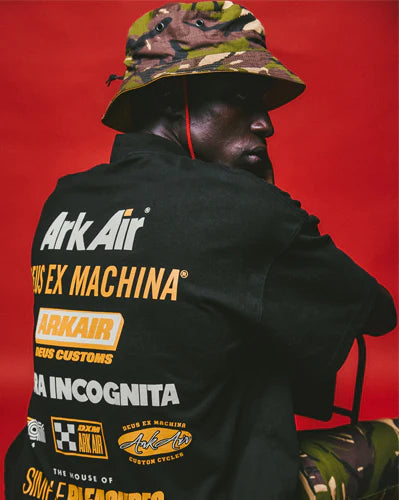 We’re thrilled to introduce our latest collaboration with ArkAir, a military-grade capsule collection that's equal parts pit-stop and paratrooper. The armed forces have provided an endless supply of inspiration over the years, so a chance to work with the best in the business was a welcome one.With forty years of experience engineering the best in outerwear, apparel and tactical equipment, Arkair’s parent company Arktis is trusted by military units and emergency services across the globe. ArkAir delivers the same cutting-edge function and durability, adapted to take you from street to peak or wherever else you might find yourself.The collection features tried and true military styles including utility powerhouse the Military Smock; With two-way zip closure, four front pockets and additional internal pouches, velcro cuffs and a reinforced hood all rolled into one water-resistant poly/cotton unit.Just as good for standing out as blending in, classic British DPM camouflage has been given the Deus treatment with contrasting red & yellow panels, a not-so-stealthy tribute to motorsport exteriors, balanced by additional panels in two classic military drabs.Co-branded mock neck tees and nylon motocross jerseys featuring graphics straight from the gravel trap round out the collaboration.
