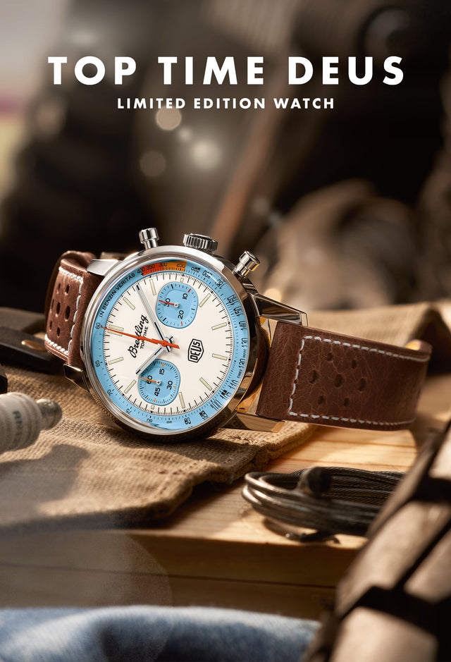 Originally launched in the 1960s, the Top Time had a clear mission: to suit the needs of "the young and active professionals" with a range of "ultra-modern chronographs". The sports watch appealed not only to that demographic but also to those attracted by its bold lines. Limited to 2,000 pieces, the new Top TIme Deus is built for open-road adventure with luminescent indexes and a white lacquered dial contrasted sky-blue on its subdials and speed-measuring tachymeter scale. While the color scheme is all new, the details that made the first collab so successful are back, including the lightning-bolt-shaped chronograph hand, mushroom pushers, racing-themed calfskin leather strap, and caseback engraving of a Deus bike and rider. Each caseback is marked with the "One of 2000" limitation.